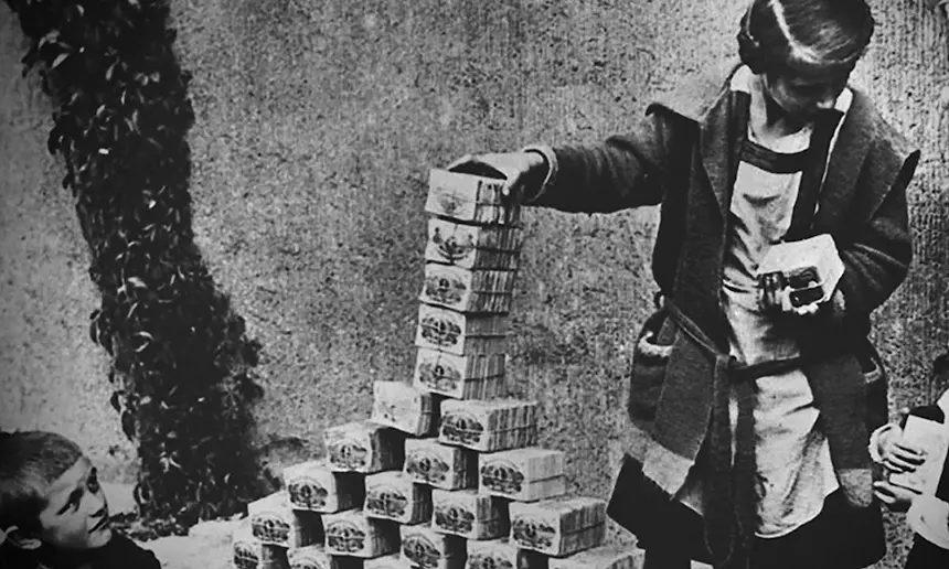 Fotografía histórica de la hiperinflación en Alemania: billetes apilados perdiendo valor.
