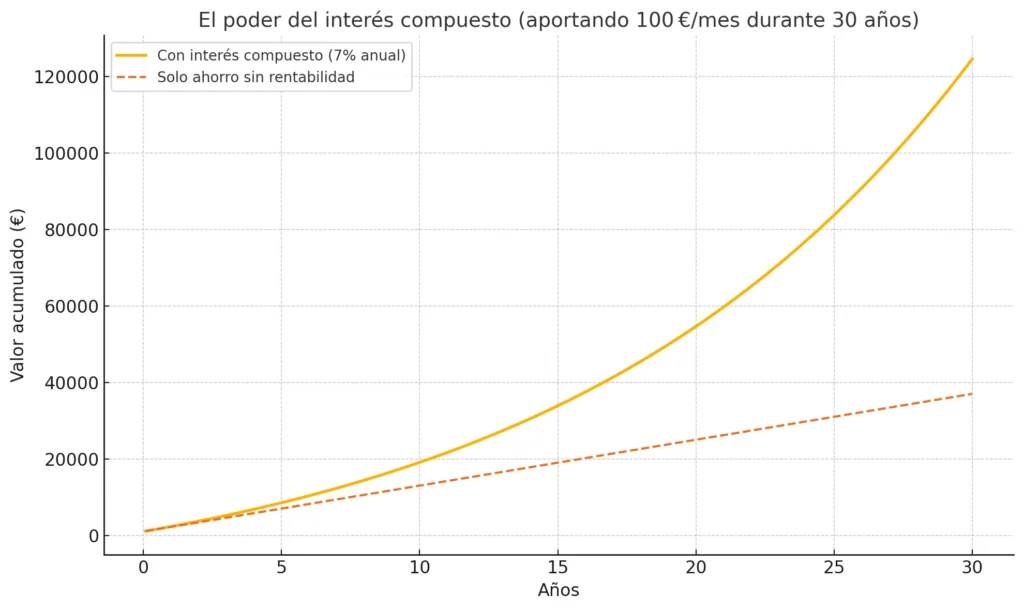 Una diferencia de más de 84.000 € sin aportar ni un euro más. Eso es lo que el tiempo y la estrategia hacen por ti. Con solo 100 €/mes durante 30 años y una rentabilidad media del 7 % anual, tu inversión superaría con creces lo que simplemente ahorrarías sin obtener rentabilidad.